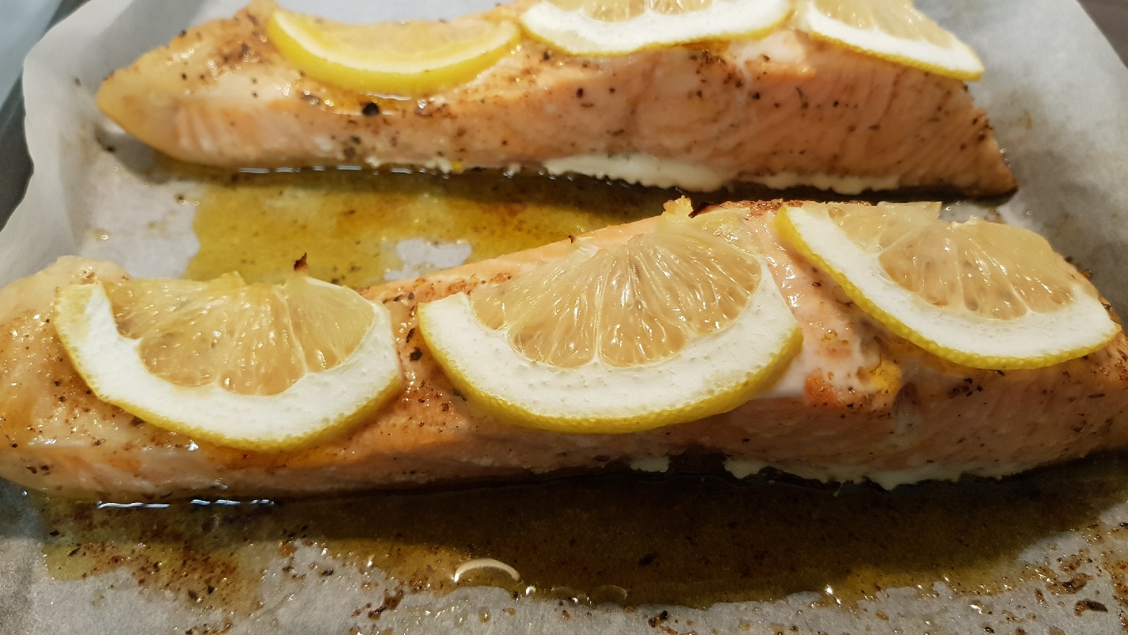 - Place the salmon, skin side down on a lined baking tray and pour the cajun seasoning mixture all over the fish. Then, put 2 to 3 thin slices of lemon on the top of each fillet. Set aside.